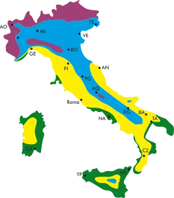 L'Italia può essere suddivisa in 4 zone geografiche sulla base della temperatura media invernale. Identifica il colore della tua zona climatica: